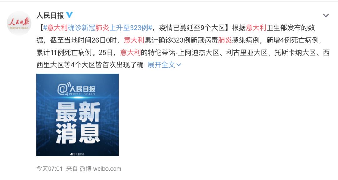 一边气他们态度轻慢蔑视,一边又希望,我是真的咸吃萝卜淡操心,根本啥事儿没有。毕竟,我们已经见亲眼证了武汉最开始的样子,就真的不希望,再有别的地方重蹈覆辙。然而,发完那篇文章之后,后面发生的事情,却只是让我更惊更怕。除了日本韩国,意大利、伊朗通通爆发了更可怕、更魔幻的肺炎剧情……所以今天,我还是要写这篇文章,要带你们看看世界各地现在的状况,并再次郑重的说出那件事——说实话,之前我根本没想到,意大利这个离亚洲并不近的国家,竟然会成为肺炎重灾区。但就在昨天0点,意大利确诊人数飙升至323例,蔓延至九个大区。甚至也是在前几天,世界卫生组织表扬还表扬了意大利的行动:朝着正确的方向。 直到我看到了这个被媒体称为“超级传播者”的意大利1号病人。在被隔离之前,他参加了多城马拉松,踢了足球赛,并且和朋友多次聚餐……然后,这个奔跑的病人,直接导致多个城市被封闭隔离,凭一己之力影响接近了50000人……这剧情难道不魔幻吗??带着传染病跑遍马拉松,电影都不敢这么写。 这位38岁的患者,之前从未来过中国,仅仅和一个到过中国的朋友吃过饭(这个朋友已排除携带病毒的可能)。然而,看到意大利民众戴口罩的样子,不得不说,真的让人很担心。光是这画面,都看得我快窒息了,简直就是病毒的“培养皿”。另一边,身在意大利的华人,感受到了疫情扩散的恐慌。 所以意大利周边的四个国家已经相继首例确诊,都和意大利有关。甚至一个巴西男子,在意大利旅游之后也确诊了新冠肺炎,至此,南美也有了首例病患。这状况真的让我想起一个月前,国内各地出现首例感染的状况……我真的希望,我们当初的悲剧,千万千万不被要在全世界不断重播。在武汉工作的伊朗籍咖啡师Sina,没有乘坐包机返乡,而是留守在武汉,一直在和同事们给前线医生、护士免费送咖啡。相比医疗水平发达的欧美,中东,尤其是伊朗处境更危险。截至2月25日,中东有新冠肺炎确诊病例的国家已增至9个。伊朗出现95例确诊,16例死亡,让人不安的是,目前伊朗还没有治愈病例出现。比如,2月19日,伊朗首次宣布,在国内发现新冠病毒的确诊病例。但奇怪的是这两名患者,他们没有出国,甚至连省都没出去过,也没有证据显示他们曾接触过中国人。确诊后,他亲自录制了一段视频,确认自己感染了病毒这件事,但也乐观的表示 —— “我们会战胜病毒”只是,从众多新闻报道中,我还是看到了似曾相识的画面 ——这位卫生副部长,在确诊的前一晚,参加了电视节目的访谈。期间他不停咳嗽,数次打断采访,最后还无奈的调侃自己,或许应该捂着嘴巴…而在政府新闻发布会上,他不仅咳嗽,出汗,而且没有佩戴口罩等防护措施。最终的结果是作为卫生部官员的他也确认感染,和他接触过的主持人和记者们都被隔离……另外,伊朗还经历着经历长期的战乱和美国的经济制裁,这真的让状况有如雪上加霜。截止到今天,日本确诊人数达到了862例,而且多地出现了无法确认感染路径的病例。感染范围也从一开始的公主号游轮,扩散到了日本县区和街道。好在今天日本首相终于想起来:要求取消或推迟未来两周的大型活动。而韩国的情况比日本更恐怖,一场现实版的《流感》正在韩国真实地上演。短短几天,累计确诊人数达到1595例,仅昨天一天就新增334例,死亡人数也达到12人。前有“新天地”邪教礼拜时禁止戴口罩,后有集会组织者坚持要集会。更魔幻的是,昨天大邱市副市长和总统开完会之后,得知自己的秘书确诊。导致整个青瓦台都被紧急隔离,韩国总统也面临疑似感染的风险…韩国也将预警级别从“警戒”提升到最高的“严重”级别。如果说当时是害怕他们重蹈覆辙,今天更多的就是害怕——因为韩国并没有实行出境管制,在韩人员这几天疯了一样的涌入中国几个沿海城市:昨天首尔飞青岛的航班,即使票价从500涨到4000元以上,仍一票难求;昨天的烟台,大批韩国返烟人员未经隔离,直接入住小区,烟台市民集体恐慌;更令人害怕的是,在昨天韩国仁川飞威海的航班上,检查出了5名乘客体温异常,163人被集中观察。疫情才刚刚平缓,但是我们不得不再次面对疫情反弹的风险。付出了生命的代价、经济的损失、全国人民守住疫情防线,疫情好不容易开始得到控制的时候,或许我们喘口气的时间都没有,压力便又来了…上面讲的每一个国家、每一个地区的疫情,已经令人很揪心了。它们和武汉一起,不断在向我们印证着一件事:面对病毒,千万千万不能掉以轻心。不知道是不是因为疫情终于有了一点点好转,这两天,有一大批人开始出动了。新闻说,南宁公园的樱花开了,所以周末每天都有7、800人来看樱花。而我仔细看了视频,这些人里,竟然还有人摘下口罩、喜笑颜开地坐在草坪上聚餐。我不想用“心大”形容他们,毕竟这种行为就是又蠢又不负责任。这个视频的截图,更是看的让人头皮发麻:人山人海,全是脑壳。杭州——超过5000人涌向西湖断桥,原因简简单单是因为天气好。 我真的想大声拿着喇叭对这些人喊:疫情根本就没有结束啊!!!!!你可以出门复工、可以购买物资,但撒欢、逛街、聚会,对不起,真的还不是时候。想想,我们已经有了武汉的教训,为什么就不能再等等??更何况,现在疫情的一点点好转,到底是什么换来的呢?就在前两天,湖北孝感市中心医院黄文军医生,才刚刚殉职。这个年仅42岁的医